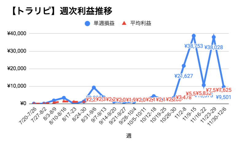 トラリピスタート時からの単週での利益推移です。