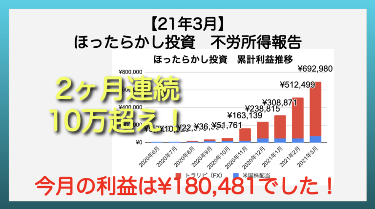先月の20万には届きませんでしたが今月も絶好調でした。2ヶ月連続で10万超えの利益です。先月に引き続きトラリピが絶好調でした。米国株の配当は3.6.9.12月は比較的多いとはいえトラリピと比べると雀の涙なので私の不労所得はトラリピの活躍次第といった形です。