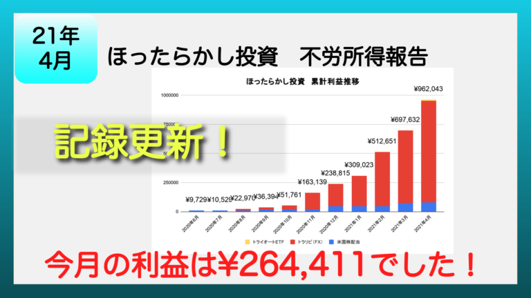 今年の2月に初の20万超え・ギネス更新をしましたが4月も再び20万超え・ギネス更新をすることができました!トラリピが24万の利益と過去最高益を更新したおかげです。そして4月からはトライオートETFの運用も始めました。4月前半トラリピがあまりにも不調すぎて一部資金をトライオートETFに移して運用開始しました。