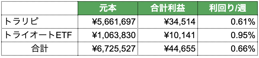 | 週 | 元本 | 合計利益 | 利回り/週 |