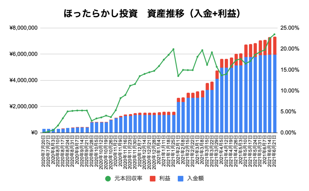 今月は6月7日週以外はコンスタントに利益が出ているので月間の不労所得も過去最高益を記録しそうです。入金+複利で少しずつ元本が増え週の利益も増えていっています。この調子でがんばります!