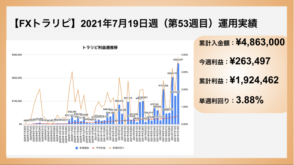 【FXトラリピ】2021年7月19日〜 53週目の運用実績 利益は¥263,497でした