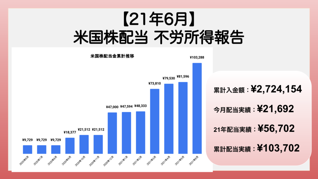 【米国株配当金実績】21年6月 30代サラリーマンの配当投資不労所得報告