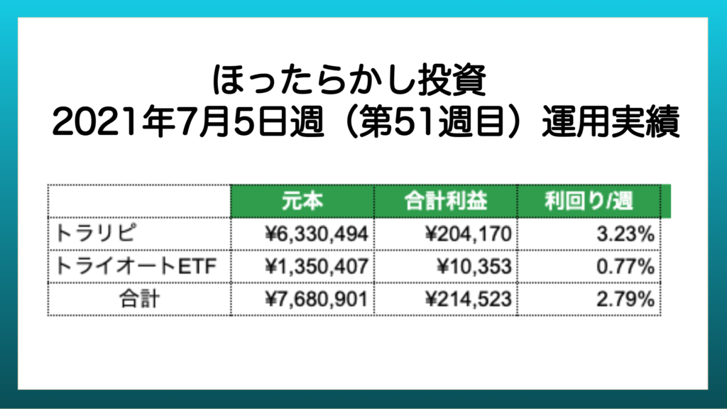 【ほったらかし投資】 2021年7月12日週 運用報告 利益は¥136,207でした