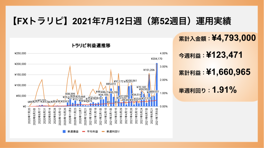 【FXトラリピ】2021年7月12日〜 52週目の運用実績 利益は¥123,471でした