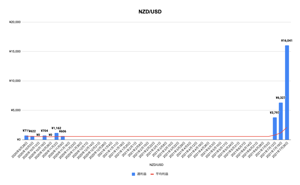 NZD/USDですが最近運用を再開しました。まだトラップ本数が他の通貨に比べて少ないのと運用期間が短くポジションもたまっていないのでこっからかな〜という印象です。