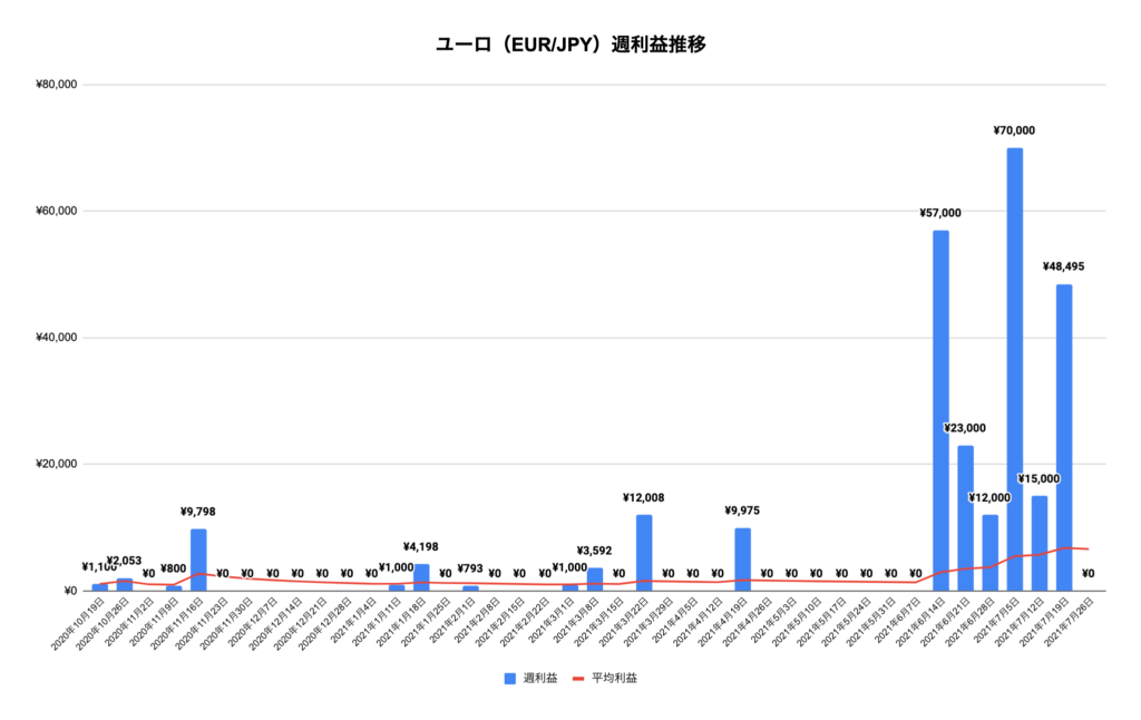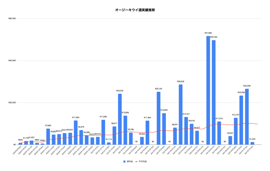 今週はギネス更新した先週に比べると半分以下の利益でしたがそれでも9万の利益で想定を上回る利益を出すことができました。7月最終週でしたが7月は毎週利益が好調だったので来月もこの調子で利益でると嬉しいです。