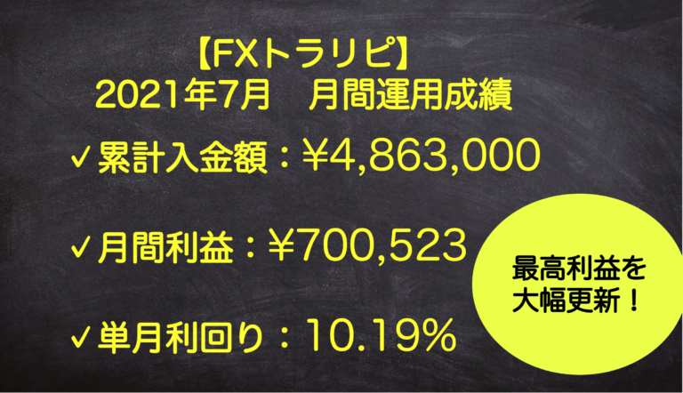 今月は爆益月間だったということもあり利回りも10%と驚異的な実績でした。これが続けば120%と資産が1.2倍になるペースです。その分リスク取っているのでロスカットに注意しながら運用していきます。トラリピは設定が全てなので月50万稼げる設定を構築して逃げ切りたいです。