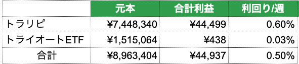 | 週 | 元本 | 合計利益 | 利回り/週 |