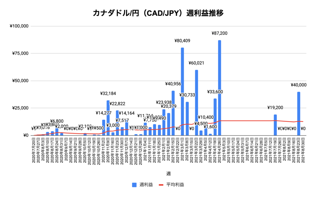 | 週 | 週利益 | 累計利益 | 平均利益 |