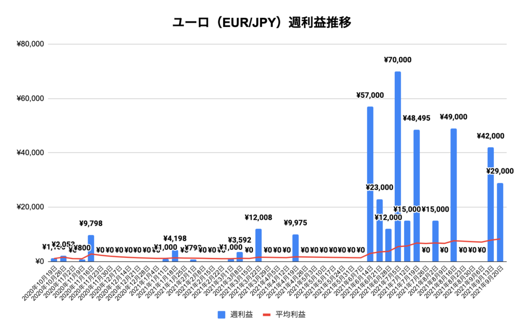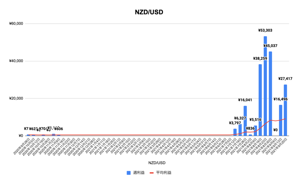 9月6日週の利益が低すぎて今月どうなることかと不安になっていましたが、9月13日・20日週連続で10万超えの利益を出せているので今月も来週の動き次第で月50万の利益が達成できそうです。