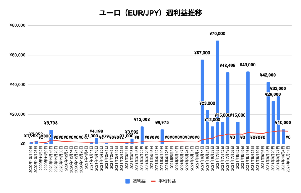 私の大好きなEUR/GBPです!ユーロポンドは抜群の安定感を誇っており23週連続で決済されています。毎週優秀なパフォーマンスで平均利益が全通貨1位とその実力を物語っています!