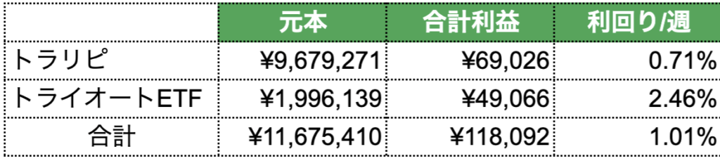 | 週 | 元本 | 合計利益 | 利回り/週 |