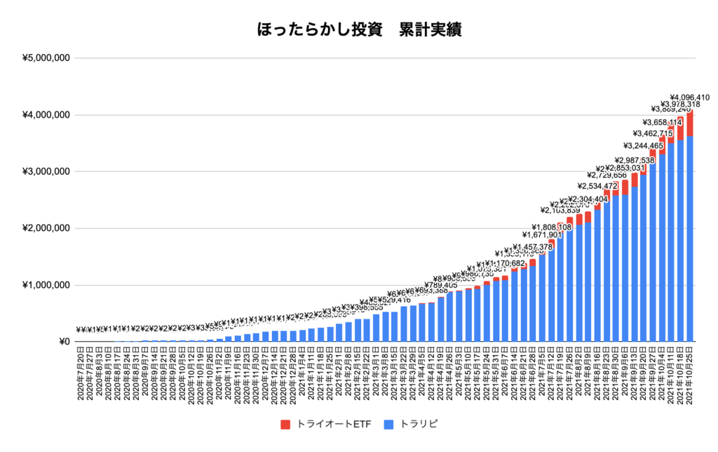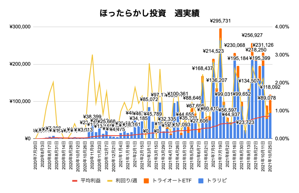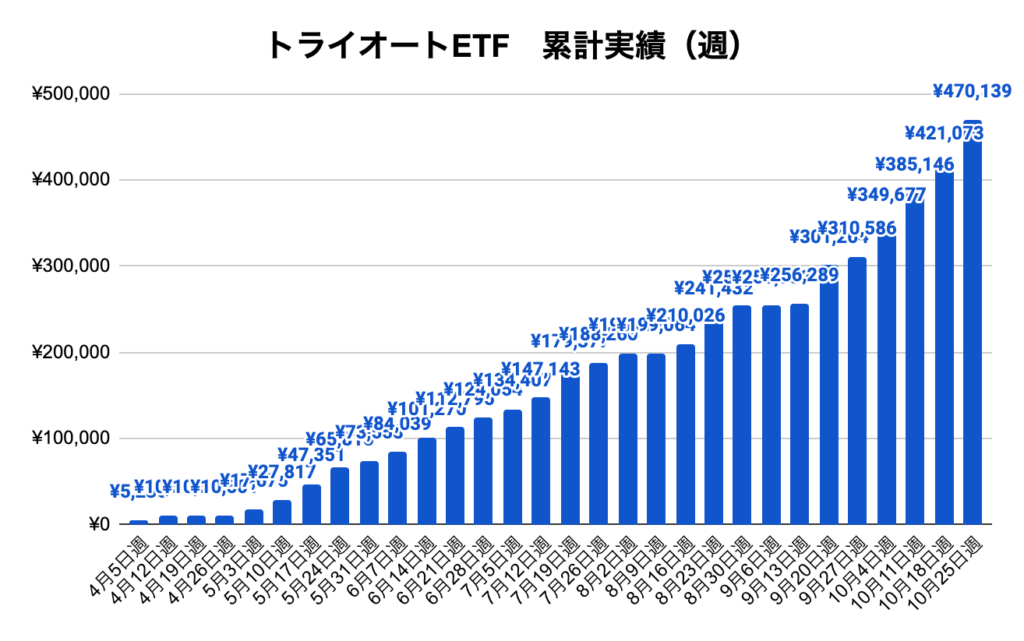 今週はトライオートETFが引き続き好調でした。トライオートETFも毎月少しずつ資金投下しているので利益も増えてきました。ここ数週間トライオートの利益が不調時のトラリピと同じくらいに成長してきたので週の利益が安定してきました。