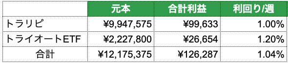 先週の過去最高利益に比べると物足りない利益ですがそれでも週1%以上の利回りで運用できているので良しとします。