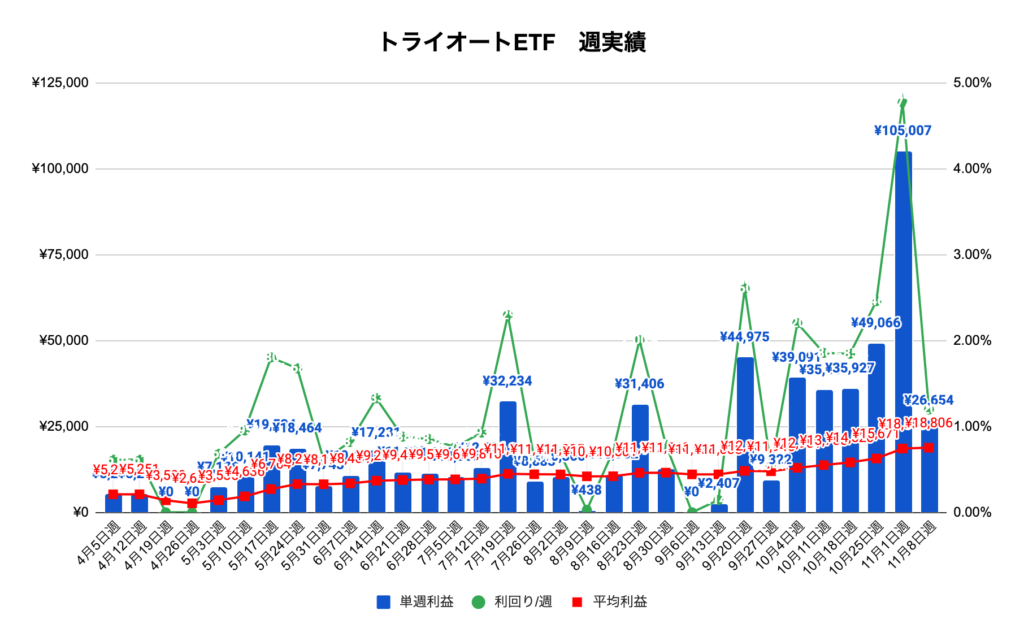 今週はトラリピ・トライオートETFともにまずまずの結果でした。両方とも1%の週利回り行ってくれたのでありがたかったです。ですがここ最近はどっちかが3-4%くらいの利益だしてくれていたのでちょっと物足りなく感じてしまいます。
