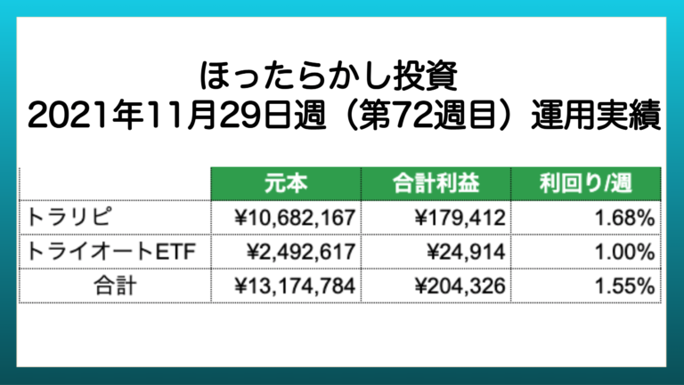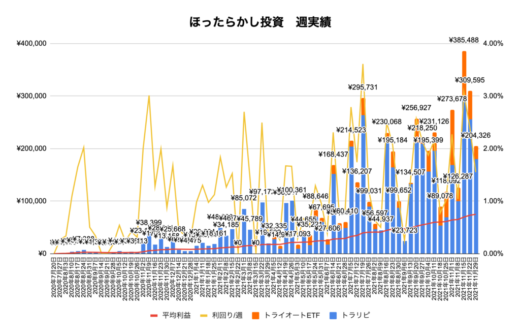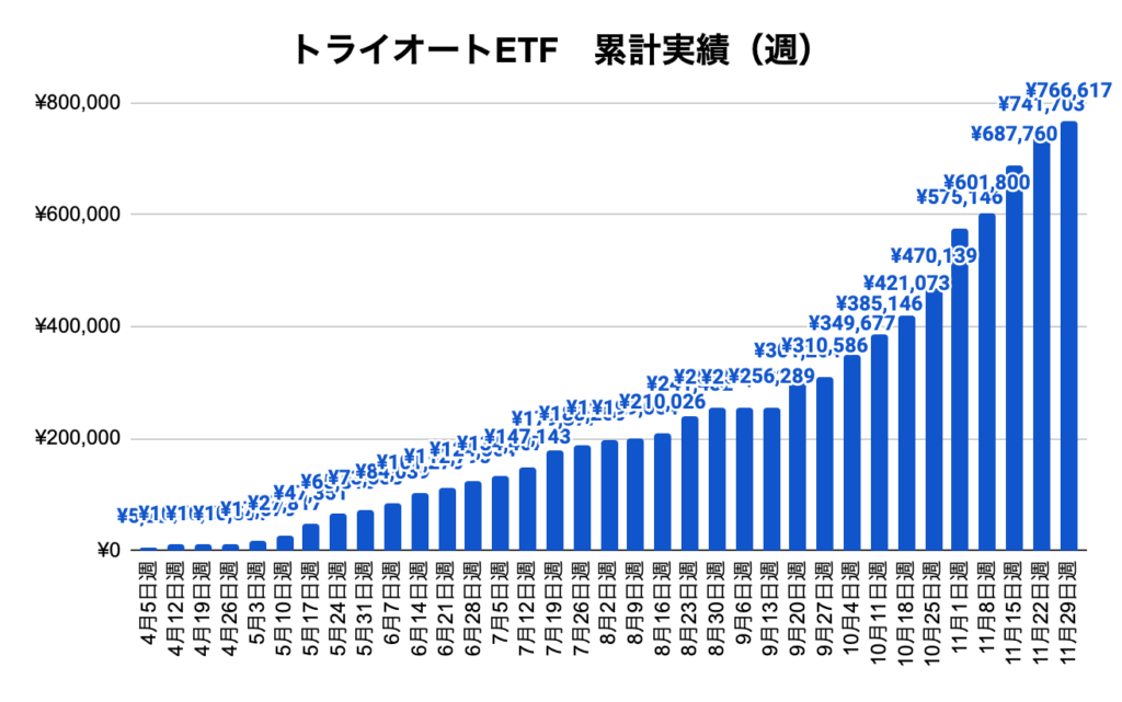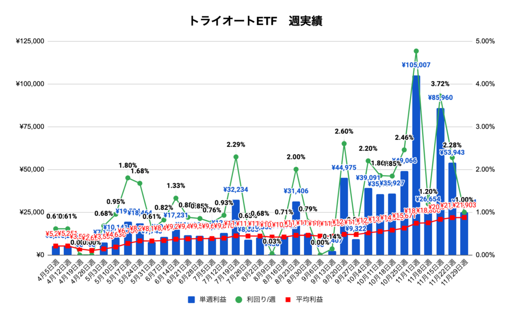 今月はトライオートETFが毎週いい感じに利益出ているのでトラリピと合算で週利益がかなり伸びています。