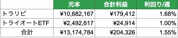 | 週 | 元本 | 合計利益 | 利回り/週 |