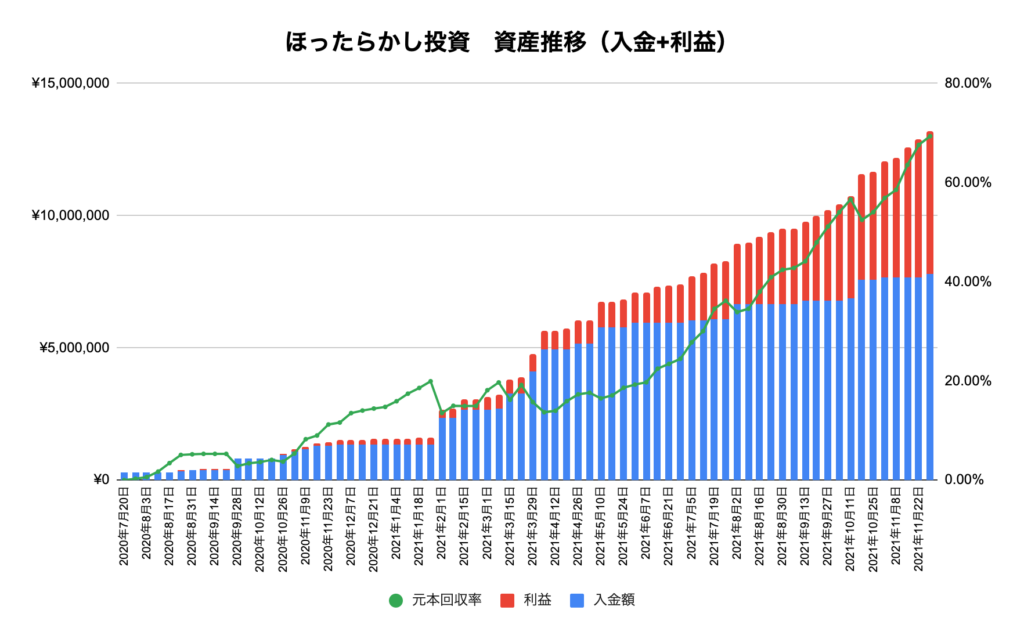 累計利益+累計入金額の合計を今年の末までに1200万という目標を1300万に引き上げましたが現在1,317万で目標達成です!