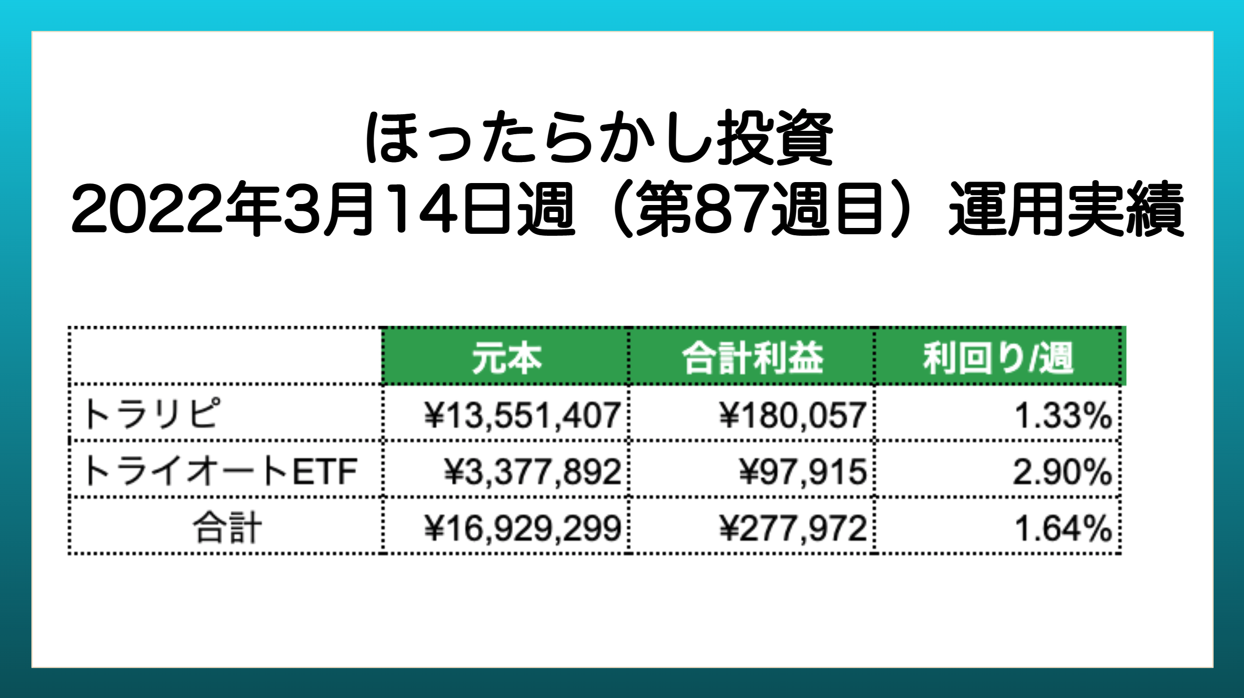 運用実績を毎月更新予定ですので私の運用パフォーマンスを参考にしていただき皆さんの投資活動・資産形成に役立てて頂けたら嬉しいです。