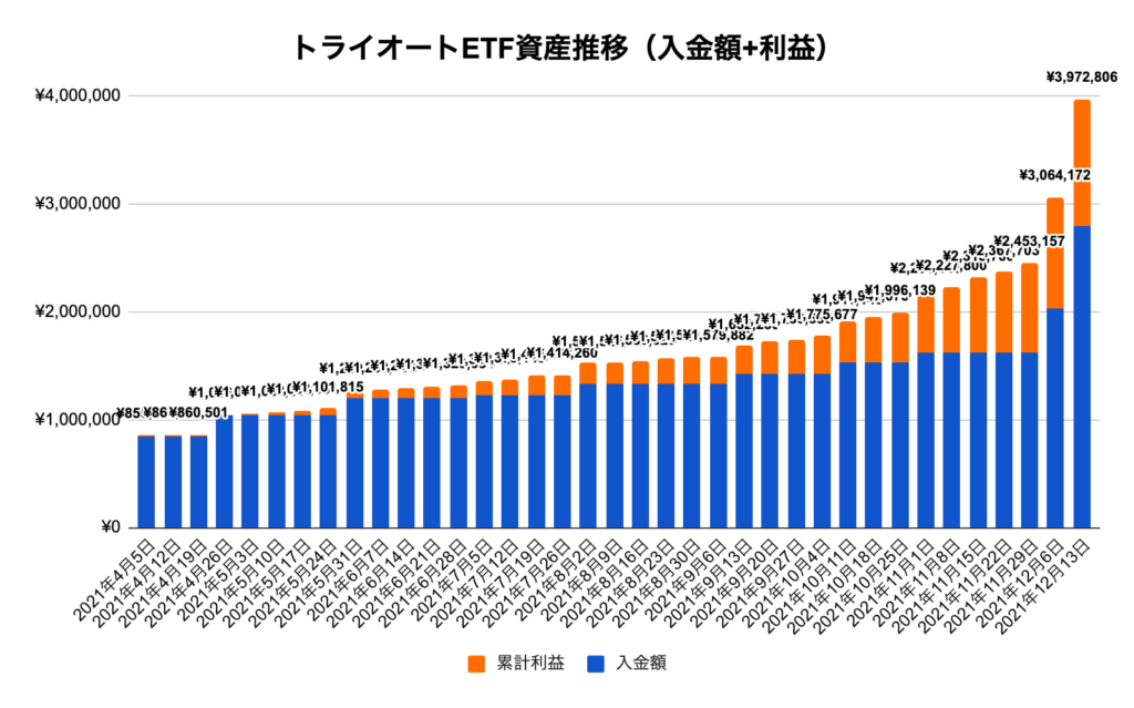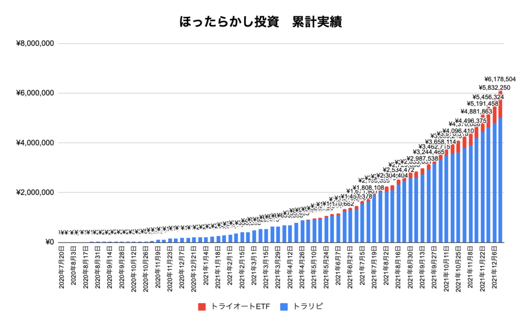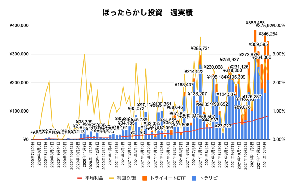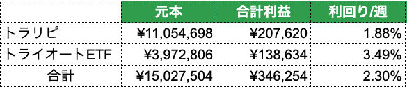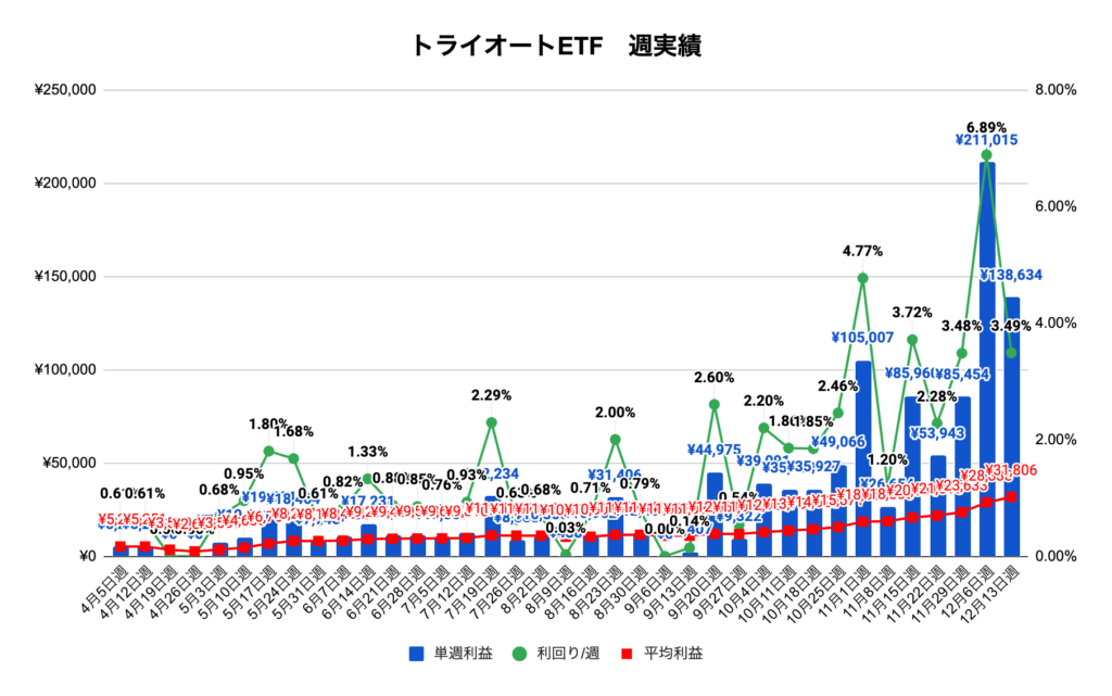 今週も30万超えの利益で2週連続30万Overを記録!トラリピもトライオートETFもいい感じで稼いでくれたのでありがたかったです。