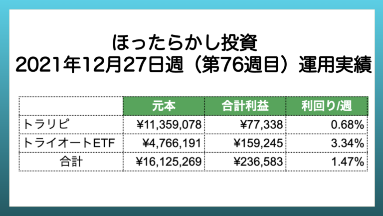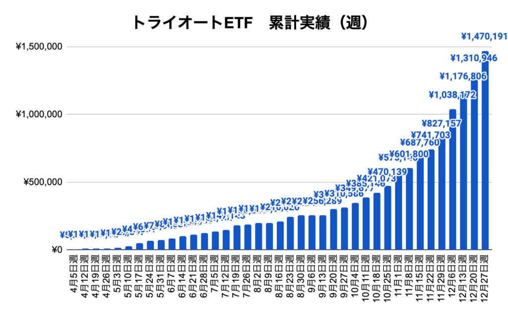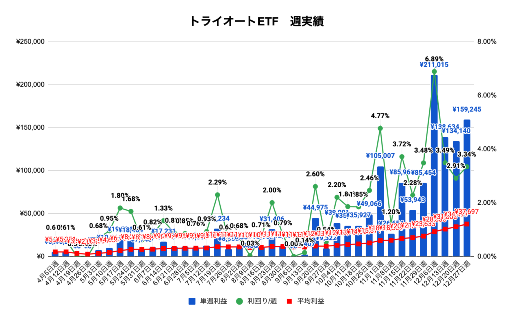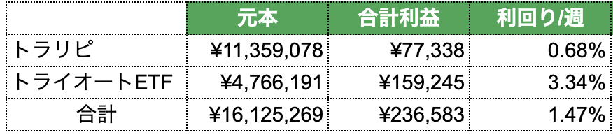 今週も30万超えの利益で3週連続30万Overを記録!トラリピもトライオートETFもいい感じで稼いでくれたのでありがたかったです。
