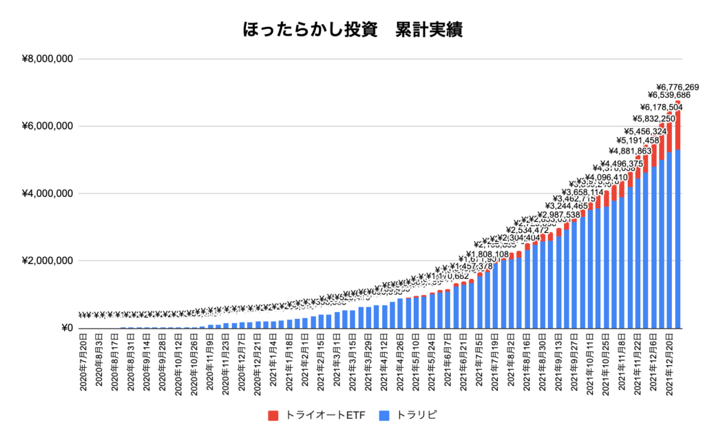 運用を開始してから1年半近くで累計利益670万とたくさん稼いでくれました。また年間の利益は別でまとめますが、今年1年かなり利益が出たので集計が楽しみです。2022年もたくさん利益でるといいな〜