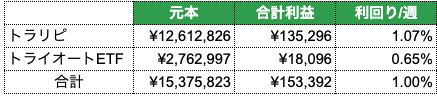 | 週 | 元本 | 合計利益 | 利回り/週 |