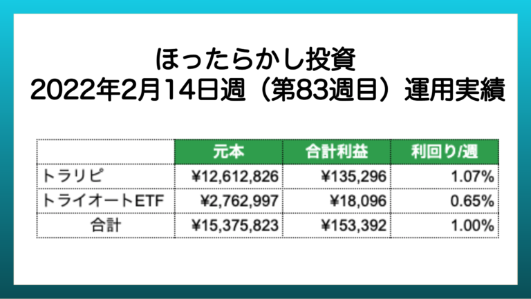 今週は週の利回りが1%とまずまずの利益でした。トラリピが安定稼働してくれているので非常に助かります。再スタートしたトライオートETFは今ポジションをためている最中なので上昇トレンドになったらガッツリ利益でそうな気がします。