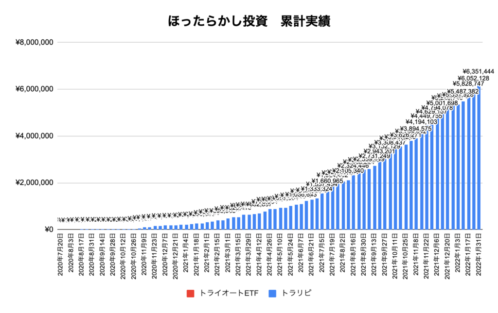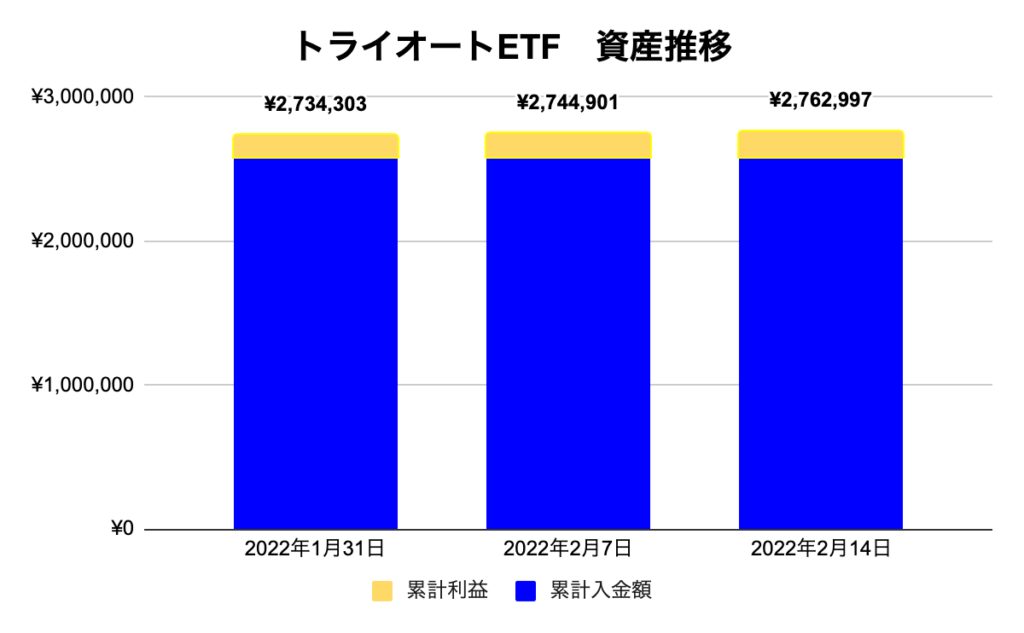こちらはトライオートETFの累計利益推移です。まだ再スタートしたばかりなのでグラフが寂しいですがコツコツ運用していきます。今月末までに5万くらいの累計利益になればいいな〜と思っていたので非常に順調です。
