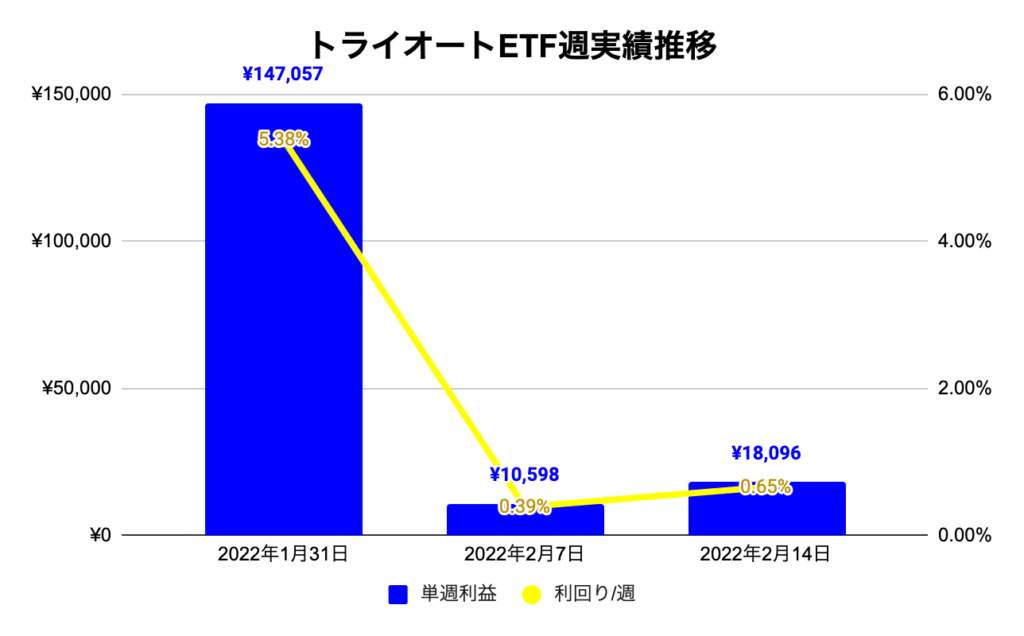 先月の半ばから週15万以上の利益が出ています。月間60万相当なので2022年の初速はいい感じで運用できています。今年はトライオートETFの元本を増やして分散させようとおもうのでがんばります。