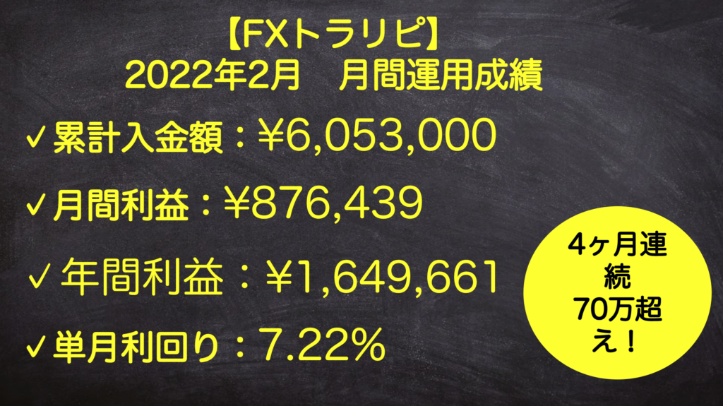 【FXトラリピ】22年2月 ¥876,439 の利益でした!セミリタイアを目指す30代サラリーマンの不労所得報告