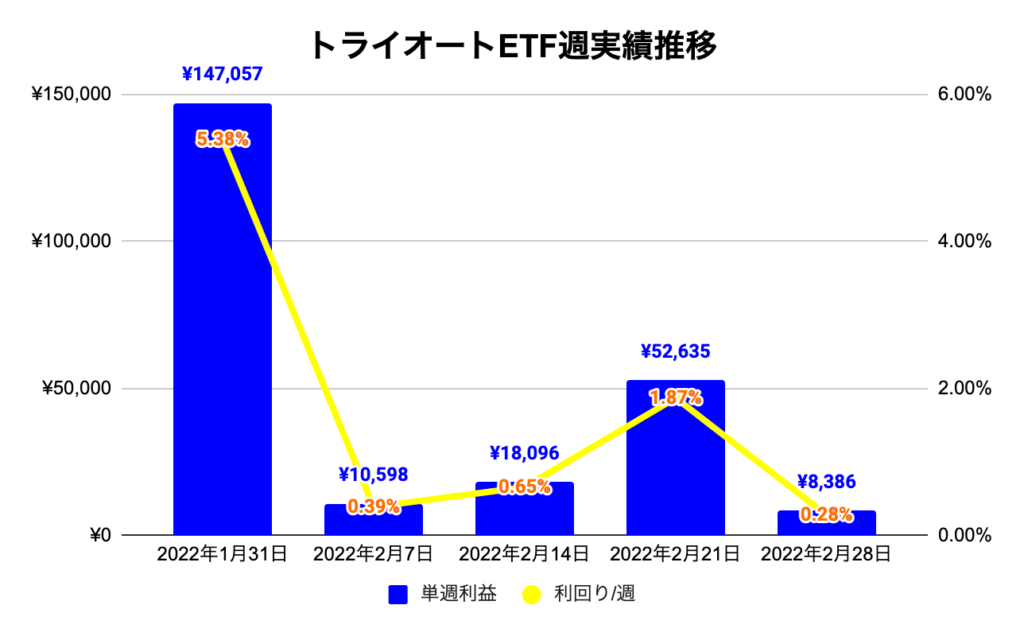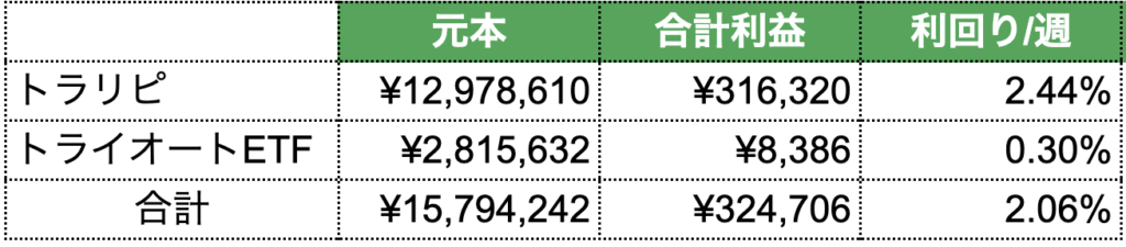 今週は先週に引き続きトラリピが爆発してくれました。トラリピだけで週利益30万超えで利回りも2%超えています。トライオートETFは先週は特に大きな動きがありませんでした。