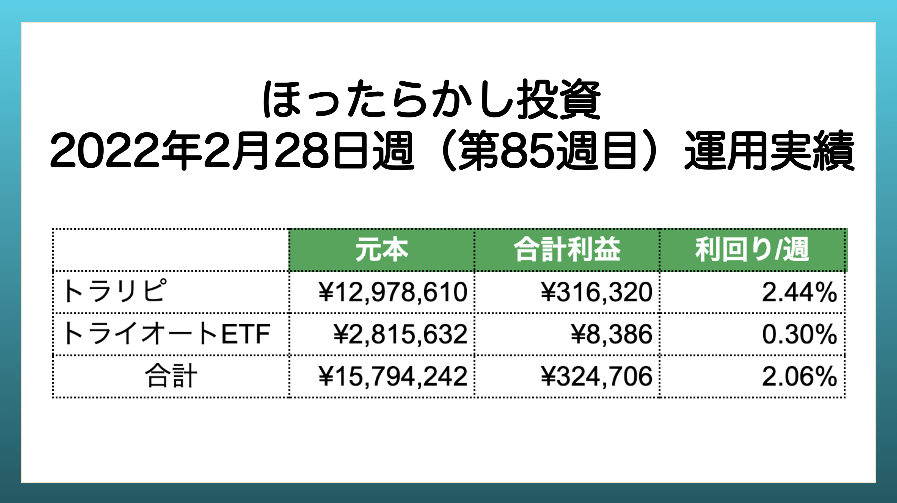 | 週 | 元本 | 合計利益 | 利回り/週 |