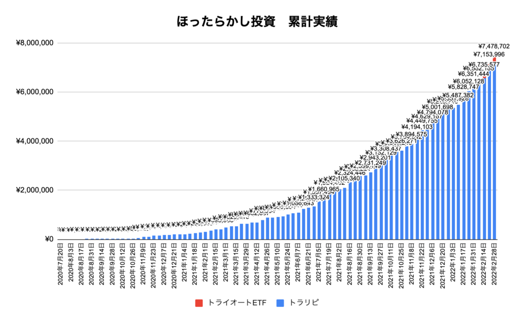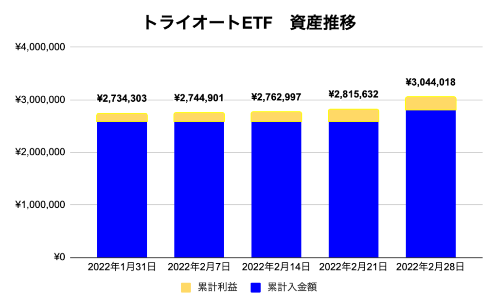 トライオートETFが2月から再スタートしている関係でほぼトラリピの利益となっています。ここからコツコツトライオートETFも利益たくさん出るように育てていきます。