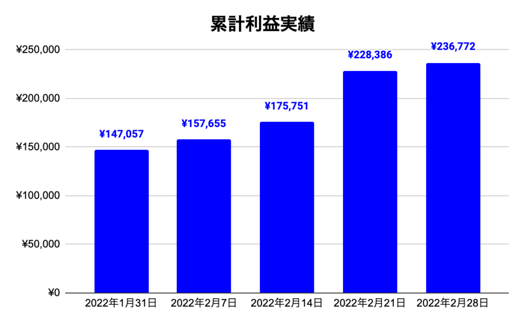 こちらはトライオートETFの累計利益推移です。まだ再スタートしたばかりなのでグラフが寂しいですがコツコツ運用していきます。今月末までに5万くらいの累計利益になればいいな〜と思っていたので非常に順調です。