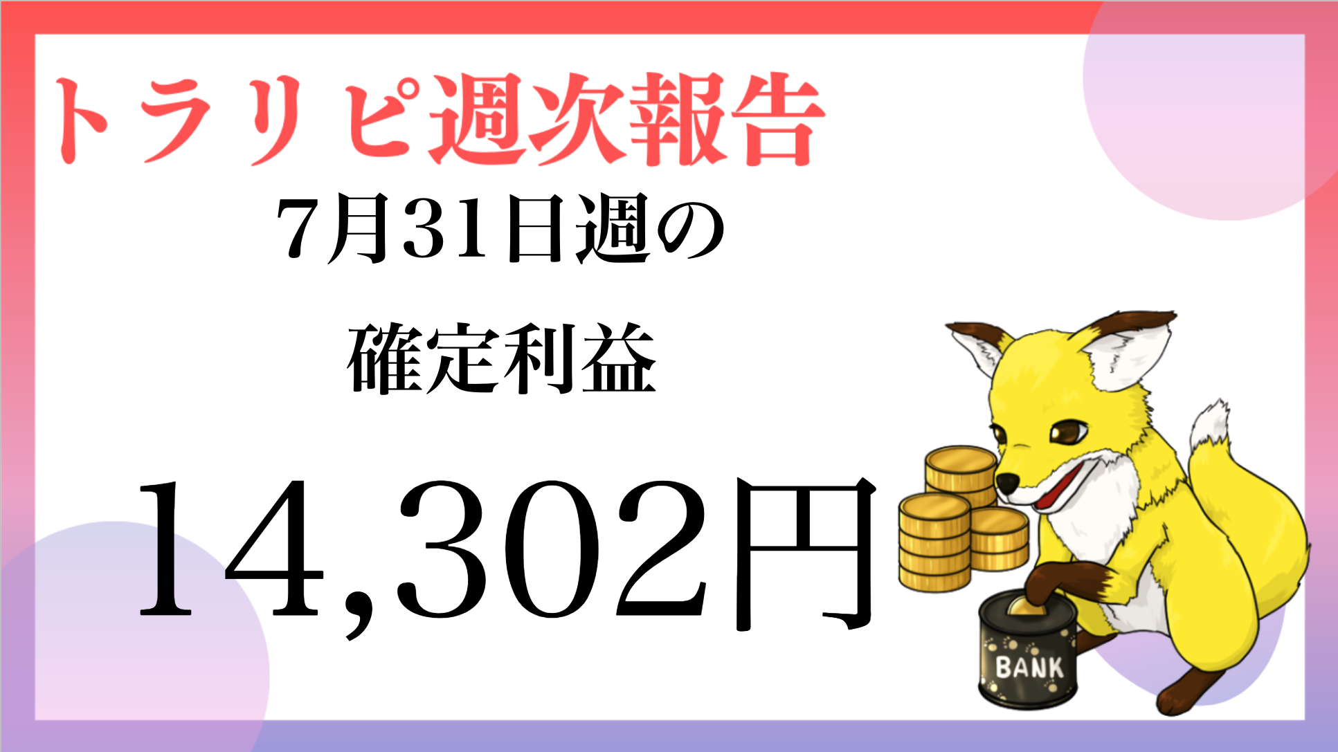 来週・再来週とこの水準で利益が出れば久々に一ヶ月の利益が10万を超えるのでなんとか10万超えの利益出てほしいです。