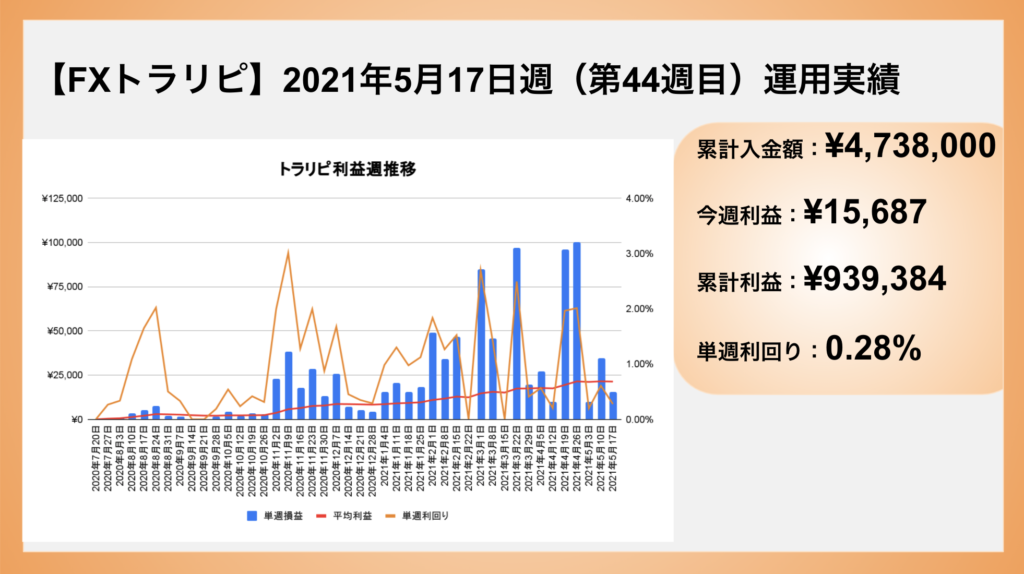 【FXトラリピ】2021年5月17日〜 44週目の運用実績 利益は¥15,687でした