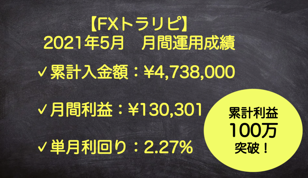 【FXトラリピ】21年5月 セミリタイアを目指す30代サラリーマンの不労所得報告
