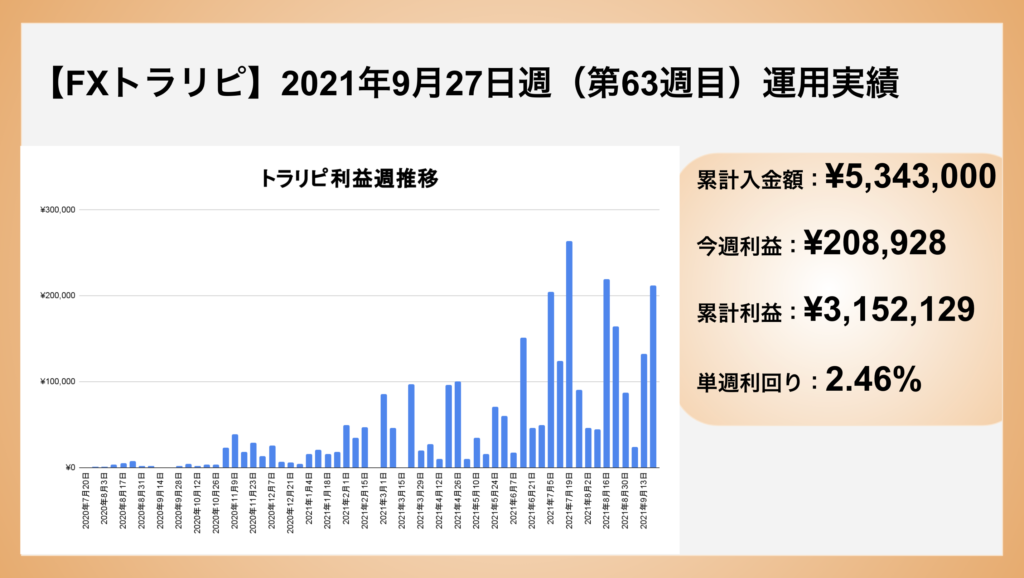 【FXトラリピ】2021年9月27日〜 63週目の運用実績 利益は¥208,928でした