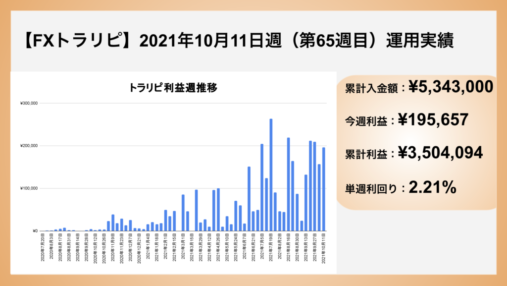 【FXトラリピ】2021年10月11日〜 65週目の運用実績 利益は¥195,657でした