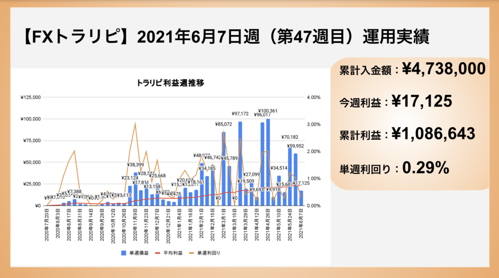【FXトラリピ】2021年6月7日〜 47週目の運用実績 利益は¥17,125でした