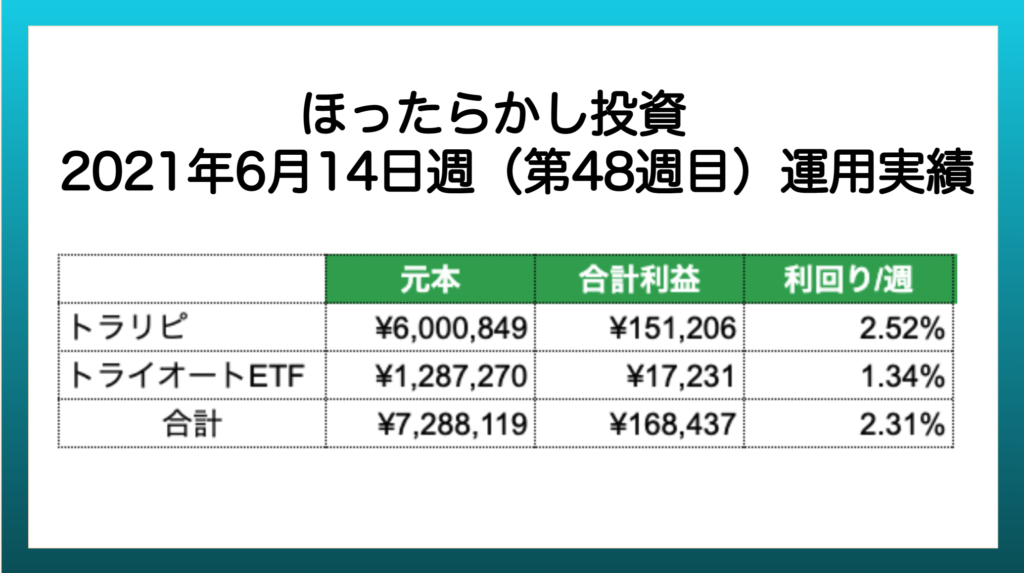 【ほったらかし投資】 2021年6月14日週 運用報告 利益は¥168,437でした。