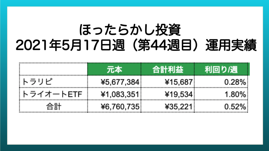 【ほったらかし投資】 2021年5月17日週 運用報告 利益は¥35,221でした。