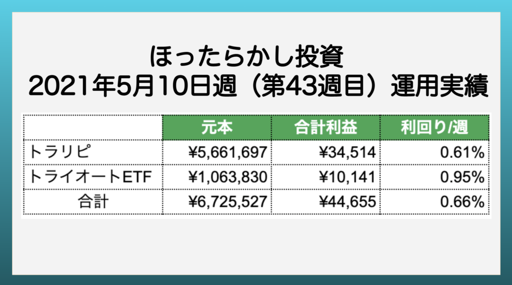 【ほったらかし投資】 2021年5月10日週 運用報告 利益は¥44,655でした。