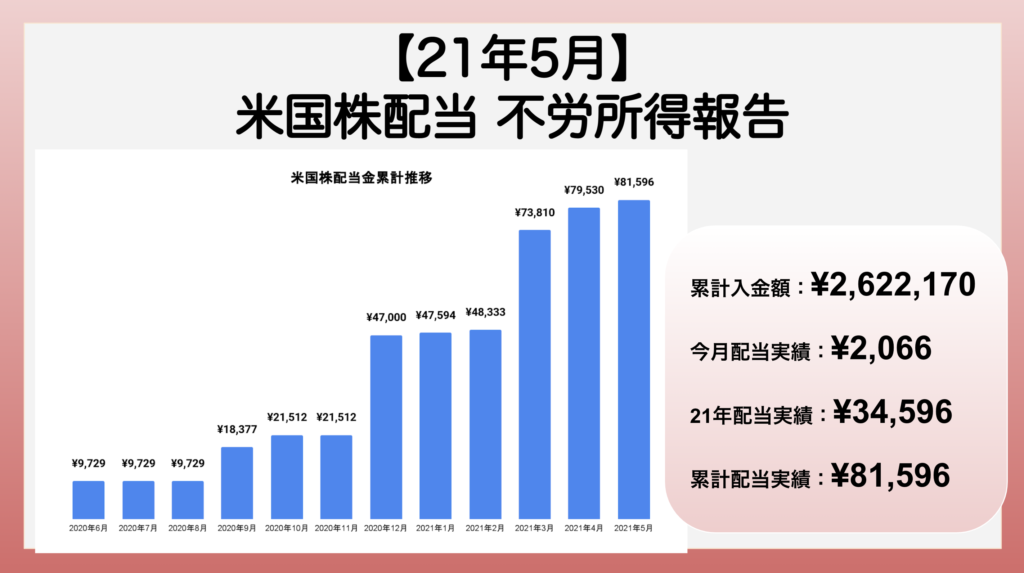 【米国株配当金実績】21年5月 30代サラリーマンの配当投資不労所得報告