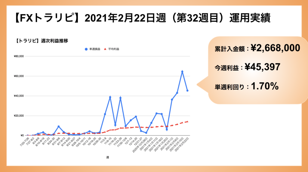 【FXトラリピ】2021年2月22日週(第32週目)週間運用実績報告